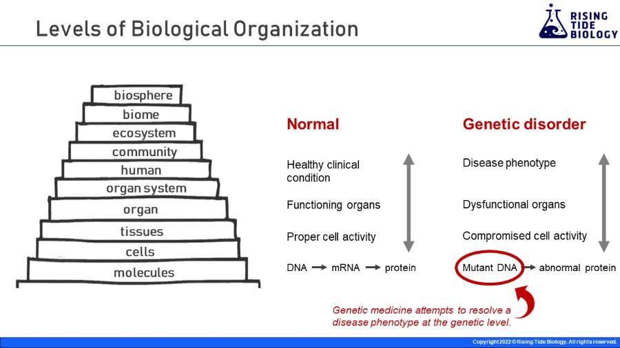 Mentally shifting up and down these biological levels allows you to think clearly about disease pathology and also helps you understand the mechanics of new genetic medicines.
