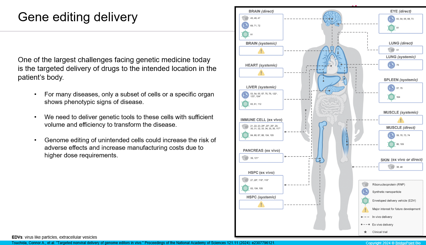 The image below illustrates different locations in the human body where scientists are currently focused on the delivery of gene editing tools. To put it simply, most diseases are caused by a malfunction in one particular tissue in the human body. To address these diseases, we need to master the skill of delivering precise gene edits into these specific tissues.