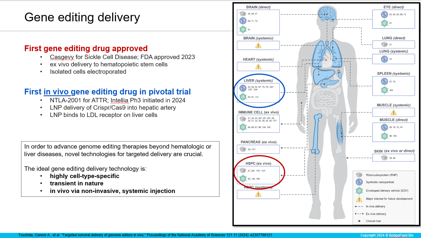 Much of the delivery work summarized above is still in the early stage of clinical trials or else still in pre-clinical (animal work). However, we do have one FDA approved gene editing drug (Casgevy, from Vertex) that is delivered to bone marrow stem cells once the cells are removed from the body.